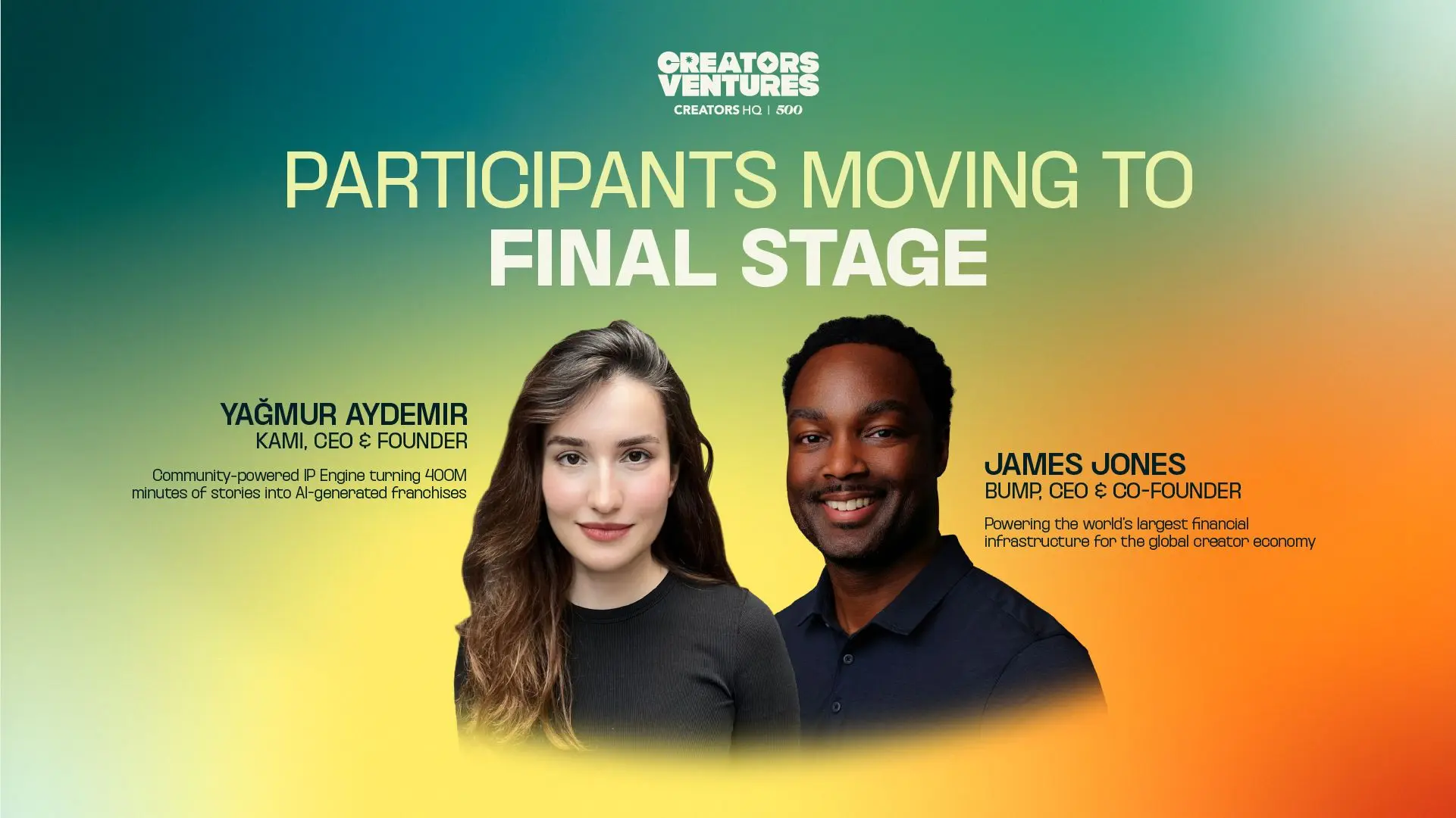 The 10-week Creators Ventures Accelerator program culminated in a final presentation at the fourth edition of the 1 Billion Followers Summit, attracting 30,000+ global attendees, 15,000+ content creators, and 500+ speakers. Moving to the final stage and qualifying for funding consideration from Creators HQ are James Jones, CEO & Co-founder of creators fintech platform Bump, and Yağmur Aydemir, CEO & Founder of community-powered stories IP engine Kami.