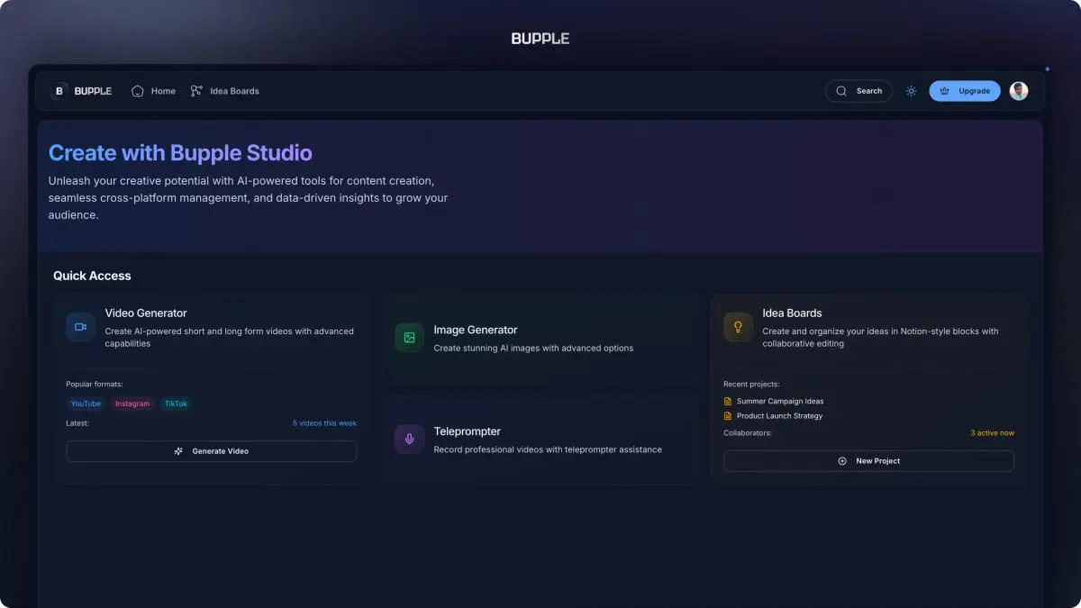 – Idea Boards: A Notion-style board to organize content ideas and enhance them with AI assistance.